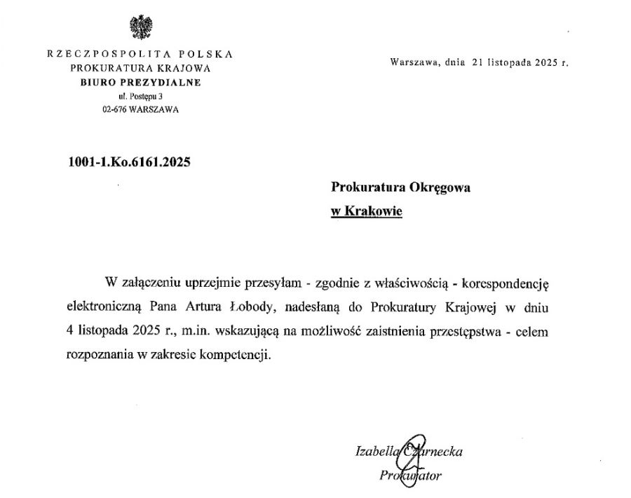 25 listopada otrzymałem pismo datowane na 21 listopada - w którym poinformowano mnie, że moje "Wezwanie" zostało przesłane do struktury uczestniczącej w opisywanej przeze mnie grupie przestępczej, a więc do Prokuratury Okręgowej w Krakowie.