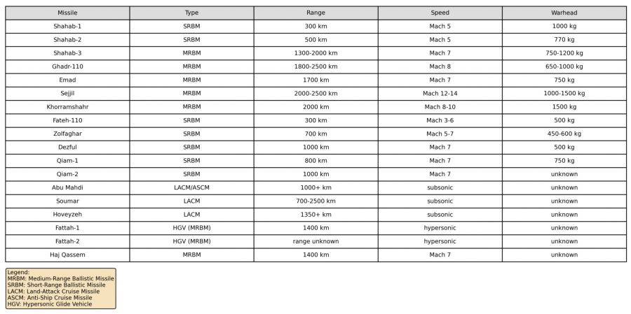 Stworzyłem tabelę wszystkich pocisków w arsenale, aby dać wyobrażenie o rozległości programu i jego możliwościach.